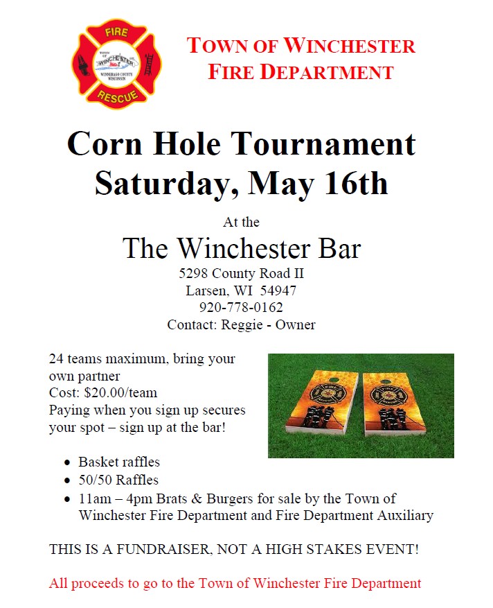 Posted on April 21, 2026, Edited April 21, 2026 by Holly Stevens Fire Dept. Fundraiser – Corn Hole Tournament – 05-16-2026